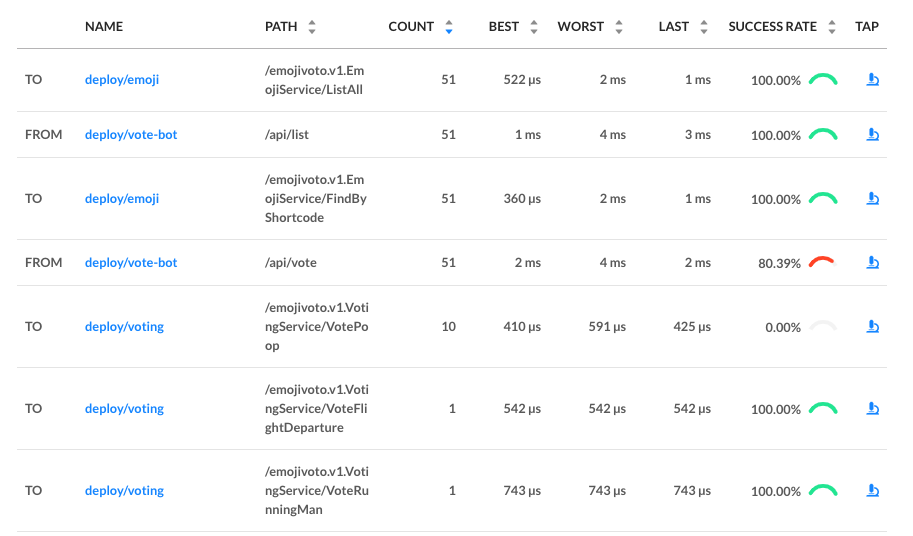 If you glance at the Linkerd dashboard (the linkerd dashboard command), you should see all services in the “emojivoto” namespace show up. Since “web” has the Linkerd service sidecar installed on it, you’ll also see success rate, requests per second, and latency percentiles show up.