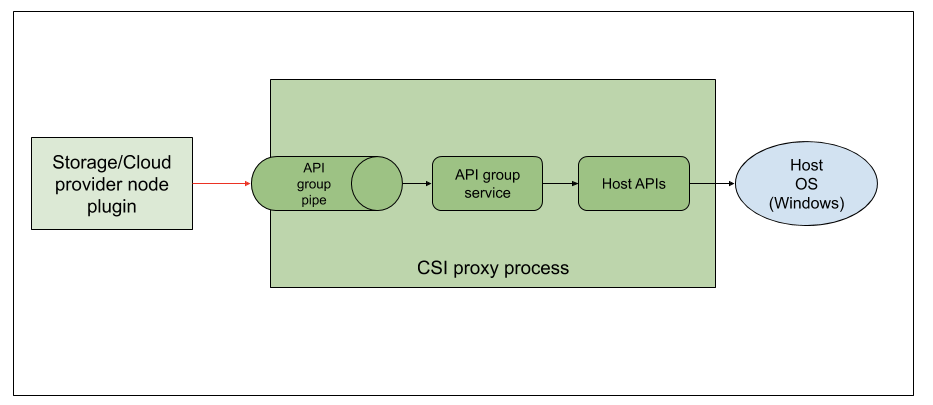 CSI proxy exposes each API group via a Windows named pipe. The communication is performed using gRPC over these pipes. The client library from the CSI proxy project uses these pipes to interact with the CSI proxy APIs. For example, the filesystem APIs are exposed via a pipe like \.\pipe\csi-proxy-filesystem-v1alpha1 and volume APIs under the \.\pipe\csi-proxy-volume-v1alpha1, and so on.