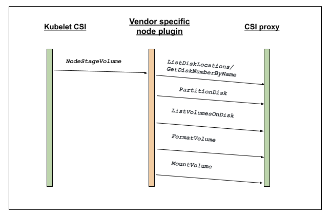 The following figure uses CSI call NodeStageVolume as an example to explain the interaction between kubelet, CSI plugin, and CSI proxy for provisioning a fresh volume. After the node plugin receives a CSI RPC call, it makes a few calls to CSIproxy accordingly. As a result of the NodeStageVolume call, first the required disk is identified using either of the Disk API calls: ListDiskLocations (in AzureDisk driver) or GetDiskNumberByName (in GCE PD driver). If the disk is not partitioned, then the PartitionDisk (Disk API group) is called. Subsequently, Volume API calls such as ListVolumesOnDisk, FormatVolume and MountVolume are called to perform the rest of the required operations. Similar operations are performed in case of NodeUnstageVolume, NodePublishVolume, NodeUnpublishedVolume, etc.